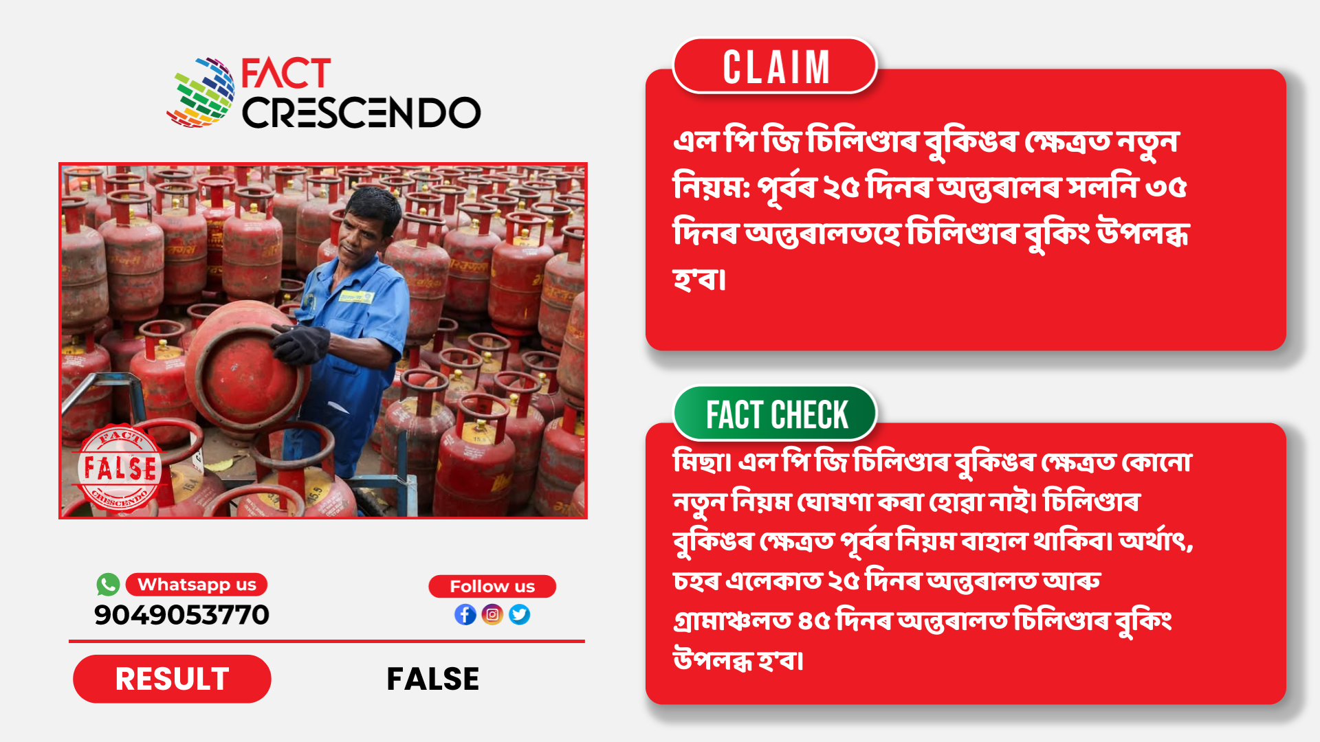 আমাৰ অনুসন্ধানৰ পৰা আমি ক’ব পাৰোঁ যে ভাইৰেল দাবীটো মিছা। এল পি জি চিলিণ্ডাৰ বুকিঙৰ ক্ষেত্ৰত কোনো নতুন নিয়ম ঘোষণা কৰা হোৱা নাই। চিলিণ্ডাৰ বুকিঙৰ ক্ষেত্ৰত পূৰ্বৰ নিয়ম বাহাল থাকিব। অৰ্থাৎ, চহৰ এলেকাত ২৫ দিনৰ অন্তৰালত আৰু গ্ৰামাঞ্চলত ৪৫ দিনৰ অন্তৰালত চিলিণ্ডাৰ বুকিং উপলব্ধ হ’ব।