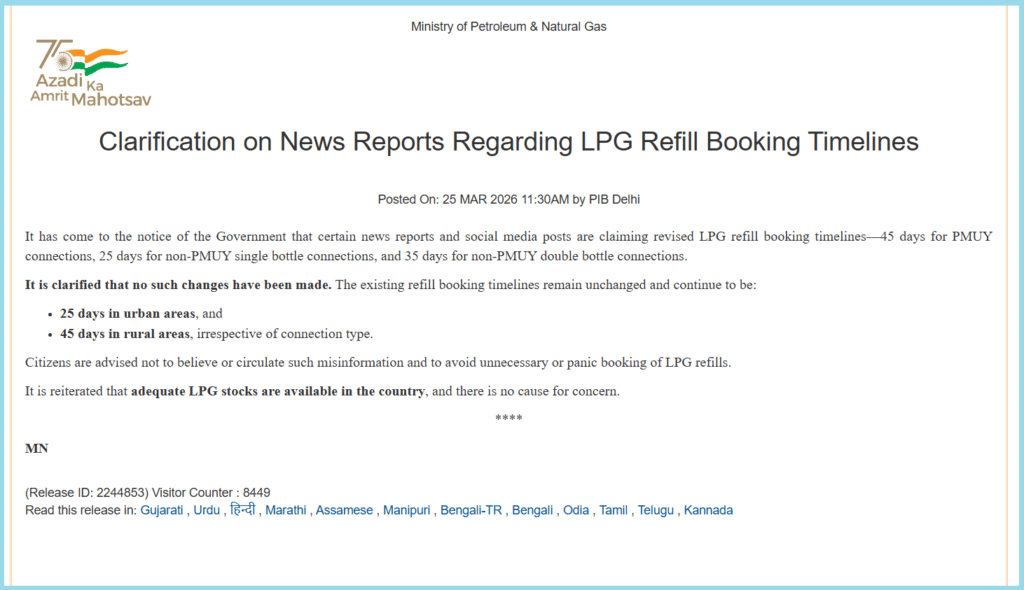 আমি প্ৰথমে প্ৰাসংগিক কী-ৱ’ৰ্ড ছাৰ্চ কৰিলোঁ আৰু তেতিয়া PIB ৰ ৱেবছাইটত ২০২৬ চনৰ ২৫ মাৰ্চৰ এক প্ৰেছ বিজ্ঞপ্তি পালোঁ। পেট্ৰলিয়াম আৰু প্ৰাকৃতিক গেছ মন্ত্ৰালয়ৰ (Ministry of Petroleum and Natural Gas) এই প্ৰেছ বিজ্ঞপ্তিত ভাইৰেল দাবীটো খণ্ডন কৰি উল্লেখ কৰা হৈছে যে চিলিণ্ডাৰ বুকিঙৰ ক্ষেত্ৰত পূৰ্বৰ নিয়ম বাহাল থাকিব। অৰ্থাৎ,