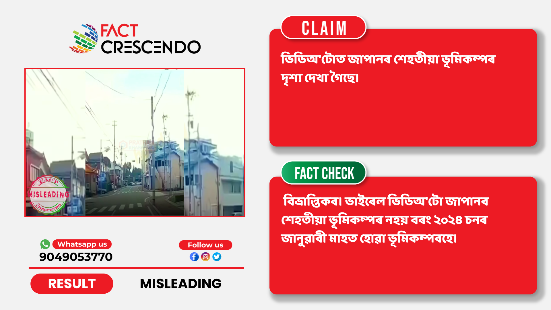 যোৱা ৮ ডিচেম্বৰত জাপানত হোৱা ৭.৬ প্ৰাবল্যৰ ভূমিকম্পৰ ফলত উত্তৰ জাপানৰ উপকূলত ছুনামীৰ সৃষ্টি হয়। এই পটভূমিত ছ’চিয়েল মিডিয়াত ভূমিকম্পৰ এক দৃশ্য ভাইৰেল হৈছে য’ত দেখা গৈছে যে ভূমিকম্পৰ সময়ত কেইবাটাও ঘৰ তীব্ৰভাৱে কঁপি আছে। দাবী কৰা হৈছে যে সেয়া জাপানৰ শেহতীয়া ভূমিকম্পৰ দৃশ্য।