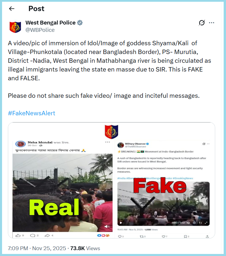 আমি প্ৰথমে ভাইৰেল ভিডিঅ’টোৰ কিছুমান স্ক্ৰীণশ্বট লৈ ৰিভাৰ্চ ইমেজ ছাৰ্চ কৰিলোঁ। তেতিয়া ২০২৫ চনৰ ২৫ নৱেম্বৰত West Bengal Police ৰ অফিচিয়েল এক্স হেণ্ডলত এটা টুইট পালোঁ। টুইটটোত ভাইৰেল ভিডিঅ’টোৰ স্ক্ৰীনশ্বট সংলগ্ন কৰি উল্লেখ কৰা হৈছিল যে সেয়া বাংলাদেশ সীমান্তৰ সমীপত অৱস্থিত গাঁও ফুনকোতলাৰ (পি.এছ- মুৰুটিয়া, জিলা- নাদিয়া, পশ্চিমবংগ) মথাভংগা নদীত কালী মূৰ্তি বিসৰ্জনৰ সময়ৰ দৃশ্য।
