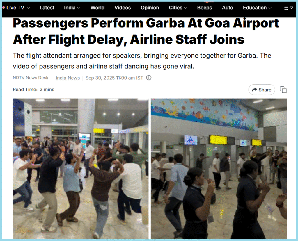 একেধৰণৰ ফটো সংলগ্ন এক প্ৰতিবেদন প্ৰকাশ পাইছিল ইণ্ডিয়া টিভিত যোৱা ৩০ ছেপ্টেম্বৰত। প্ৰতিবেদন অনুসৰি চুৰাট অভিমুখী বিমান পলম হোৱাৰ ফলত গোৱা বিমানবন্দৰত এইদৰে যাত্ৰীসকলে গৰ্বা নৃত্য পৰিৱেশন কৰিছিল।