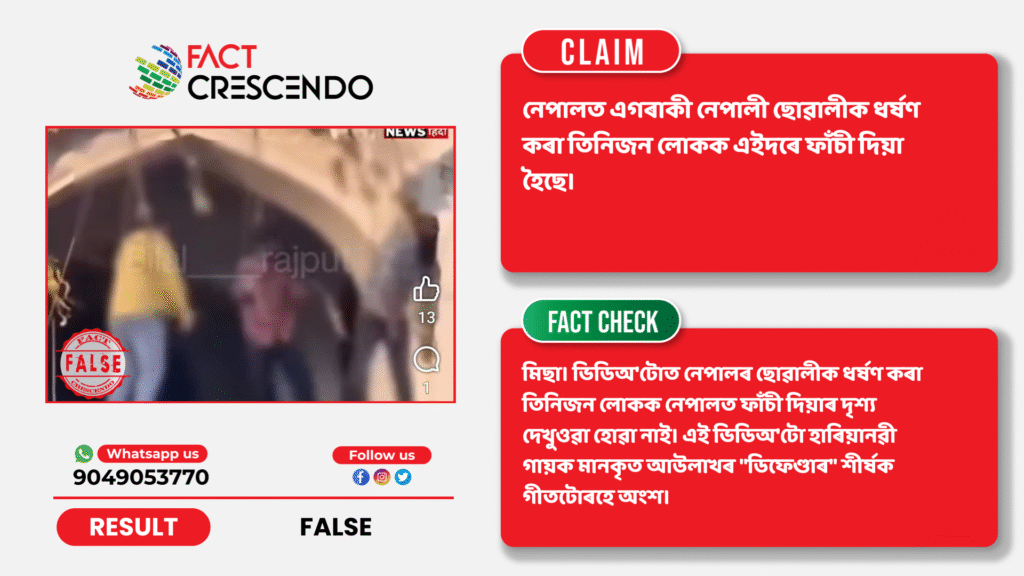 শেহতীয়াকৈ ছ’চিয়েল মিডিয়াত এটা ভিডিঅ’ ভাইৰেল হৈছে য’ত দাবী কৰা হৈছে যে নেপালত এগৰাকী নেপালী ছোৱালীক ধৰ্ষণ কৰা তিনিজন লোকক ফাঁচী দিয়া হৈছে।