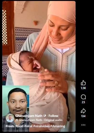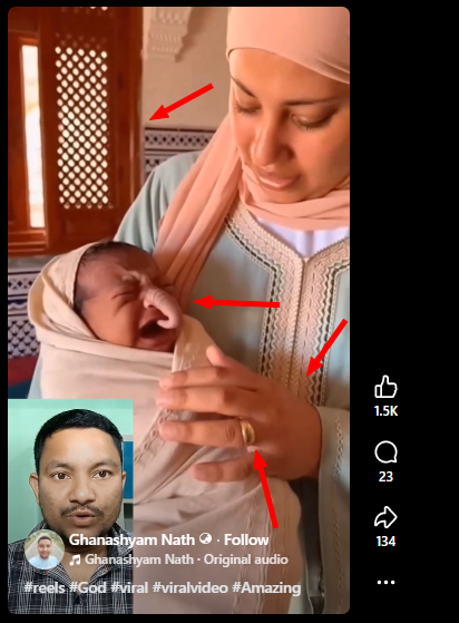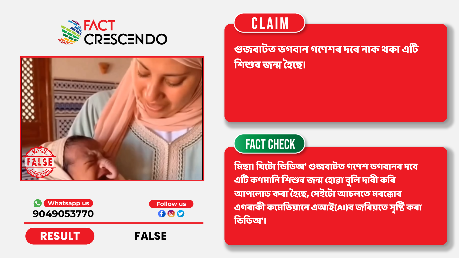 ইয়াৰ লগে লগেই আমি এই সিদ্ধান্তত উপনীত হওঁ যে যিটো ভিডিঅ’ গুজৰাটত গণেশ ভগবানৰ দৰে এটি কণমানি শিশুৰ জন্ম হোৱা বুলি দাবী কৰি আপলোড কৰা হৈছে, সেইটো আচলতে মৰক্কোৰ এগৰাকী কমেডিয়ানে এআই(AI)ৰ জৰিয়তে সৃষ্টি কৰা ভিডিঅ’।
