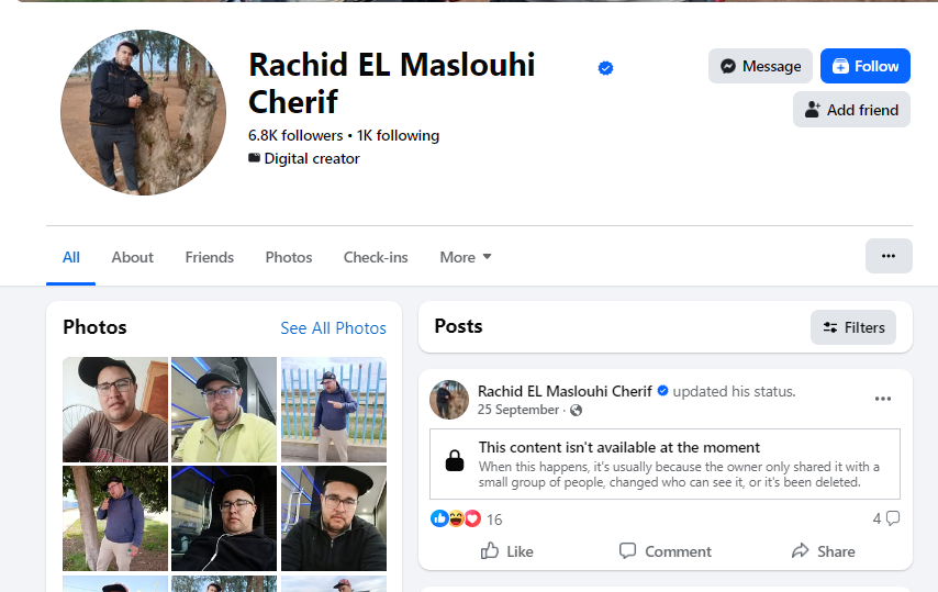 সেই নামটোৰে সন্ধান আগবঢ়াই নিওতে আমি ব্যক্তিগৰাকীৰ ফেচবুক একাউণ্টটো লাভ কৰিলোঁ। আমি দেখিলোঁ যে ZOHYRCHERIF নামৰ ইনষ্টাগ্ৰাম হেণ্ডেলটোত থকা এই অস্বাভিৱক ভিডিঅ’বোৰৰ আৰৱী ভাষাৰ বৰ্ণনা দি থকা ব্যক্তগৰাকীয়েই সেইগৰাকী ব্যক্তি।