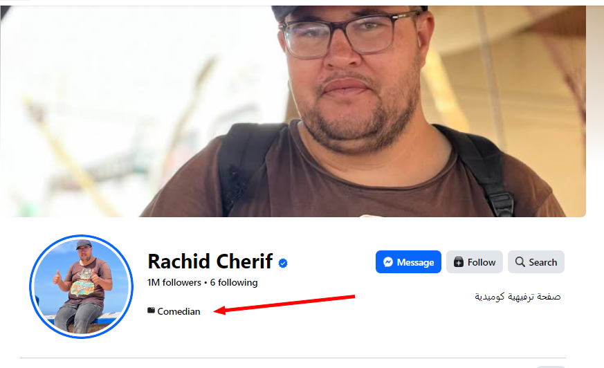 তেওঁৰ ফেচবুক একাউণ্টটোতেই আমি তেওঁৰ Rachid Cherif নামৰ ফেচবুক পেজটো সংযোগ হৈ থকা দেখিলোঁ। তেওঁ নিজকে কমেডিয়ান বুলি পৰিচয় দিয়াৰ লগতে বায়’ত আৰৱী ভাষাত লিখা আছিল এইদৰে- صفحة ترفيهية كوميدية। ইয়াৰ অসমীয়া অৰ্থ হৈছে- এটা কমেডী মনোৰঞ্জনৰ পেজ।