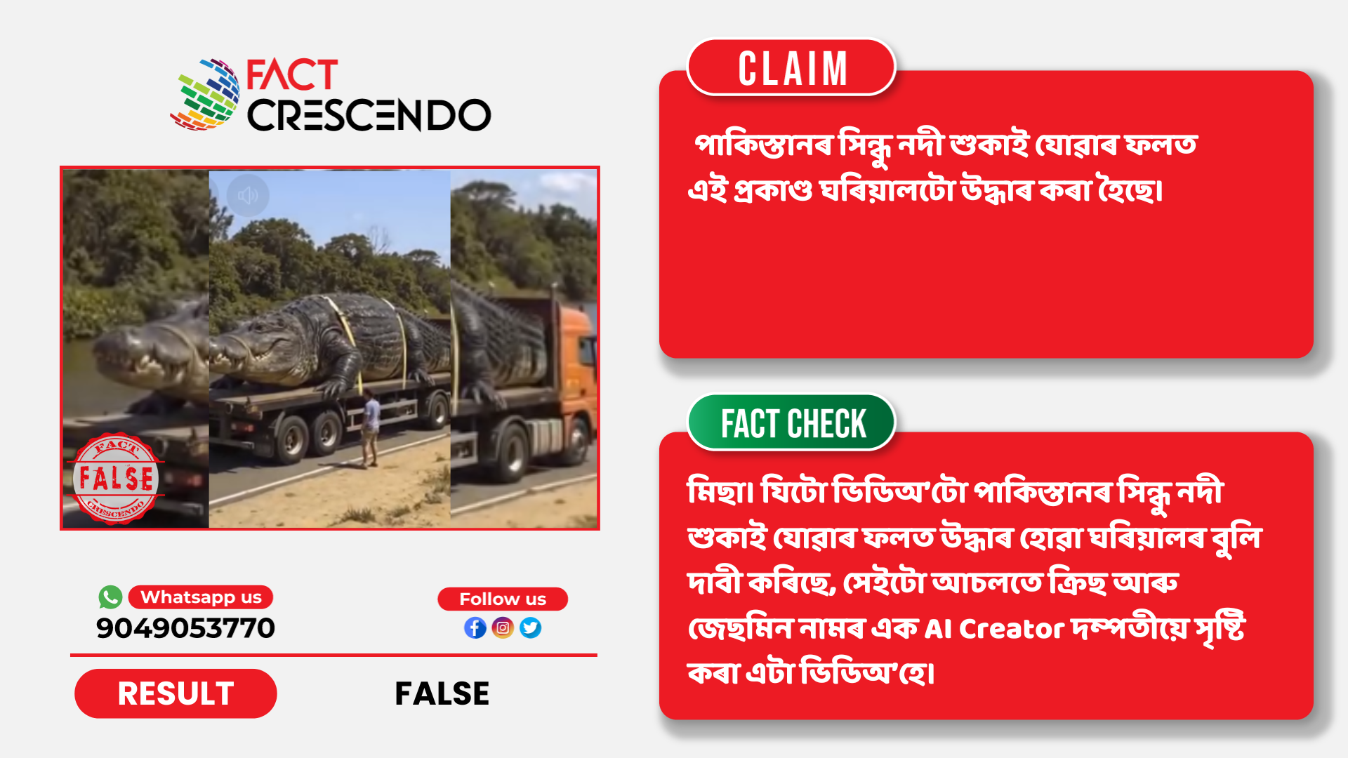 ফেক্ট ক্ৰেছেণ্ডো অসমীয়াৰ অনুসন্ধানত এই কথা নিশ্চিত হৈছে যে দাবীটো মিছা। যিটো ভিডিঅ’টো পাকিস্তানৰ সিন্ধু নদী শুকাই যোৱাৰ ফলত উদ্ধাৰ হোৱা ঘৰিয়ালৰ বুলি দাবী কৰিছে, সেইটো আচলতে ক্ৰিছ আৰু জেছমিন নামৰ এক AI Creator দম্পতীয়ে সৃষ্টি কৰা এটা ভিডিঅ’হে।