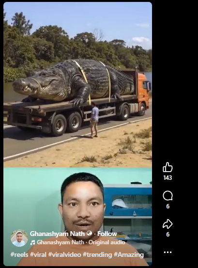 শেহতীয়াকৈ অসমৰ এজন ফেচবুক ব্যৱহাৰকাৰীয়ে নিজৰ পেজত এটা ভিডিঅ’ আপলোড কৰি দাবী কৰিছে যে সেইটো পাকিস্তানৰ ভিডিঅ’। ব্যৱহাৰকাৰীজনে কৈছে যে পাকিস্তানৰ সিন্ধু নদীৰ পানী শুকাই যোৱাৰ কাৰণে ভিডিঅ’টোত দেখা বৃহদাকাৰ ঘৰিয়ালটো উদ্ধাৰ কৰা হৈছে। ভিডিঅ’টোত আমি দেখোঁ যে এখন ট্ৰাকৰ ওপৰত এটা প্ৰকাণ্ড ঘৰিয়াল বান্ধি থোৱা আছে।