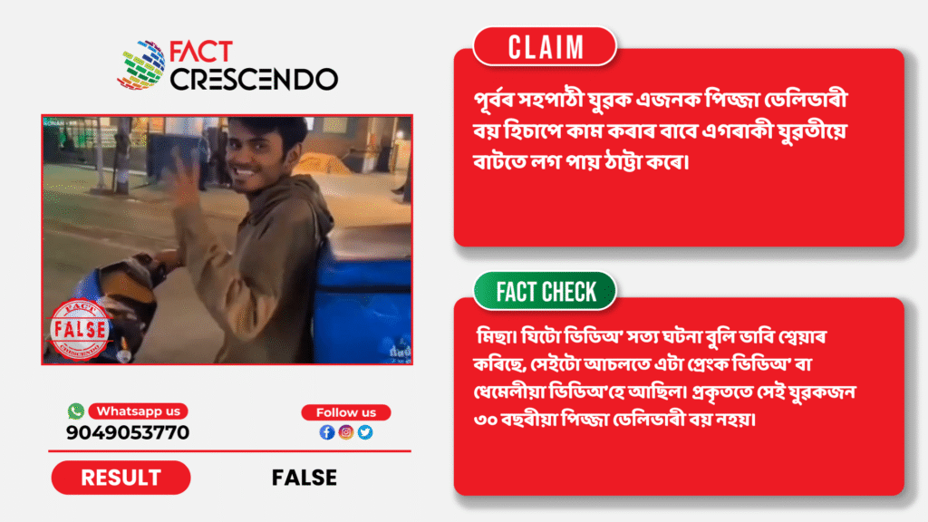 ফেক্ট ক্ৰেছেণ্ডো অসমীয়াৰ অনুসন্ধানত এই কথা নিশ্চিত হৈছে যে দাবীটো মিছা। যিটো ভিডিঅ’ সত্য ঘটনা বুলি ভাবি শ্বেয়াৰ কৰিছে, সেইটো আচলতে এটা প্ৰেংক ভিডিঅ’ বা ধেমেলীয়া ভিডিঅ’হে আছিল। প্ৰকৃততে সেই যুৱকজন ৩০ বছৰীয়া পিজ্জা ডেলিভাৰী বয় নহয়।