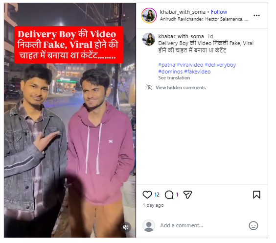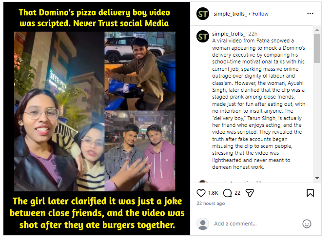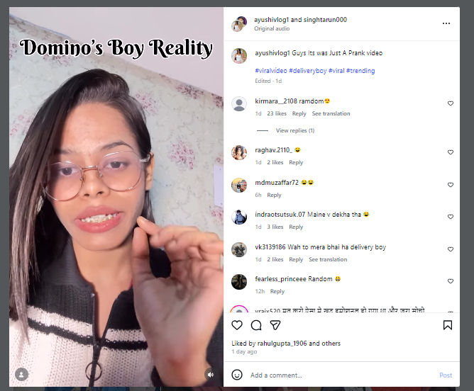ইয়াৰ পাছত আমি আন এটা ইনষ্টাগ্ৰাম পোষ্ট পালোঁ। তাত সেই যুৱক-যুৱতী চাৰিগৰাকী পাটনাৰ বুলি উল্লেখ কৰা হৈছে আৰু যুৱকজনৰ নামটো তৰুণ সিং আৰু ভিডিঅ’ ৰেকৰ্ডিং কৰা যুৱতীগৰাকীৰ নাম আয়ুসী সিং বুলি উল্লেখ কৰি তেওঁলোকে ধেমালিৰ বাবে স্ক্ৰিপ্টেড ভিডিঅ’ প্ৰস্তুত কৰা বুলি কোৱা হৈছে।