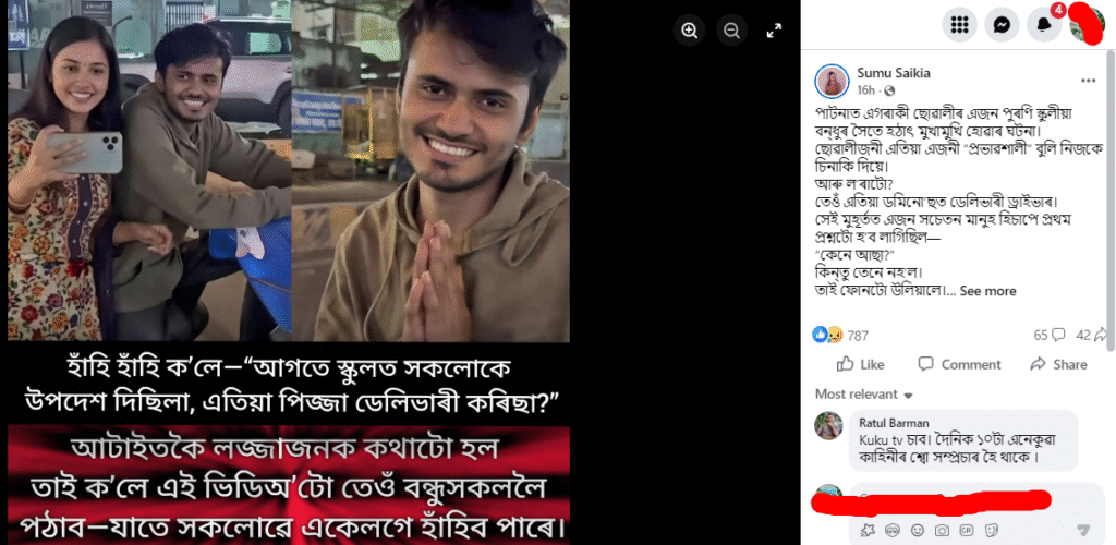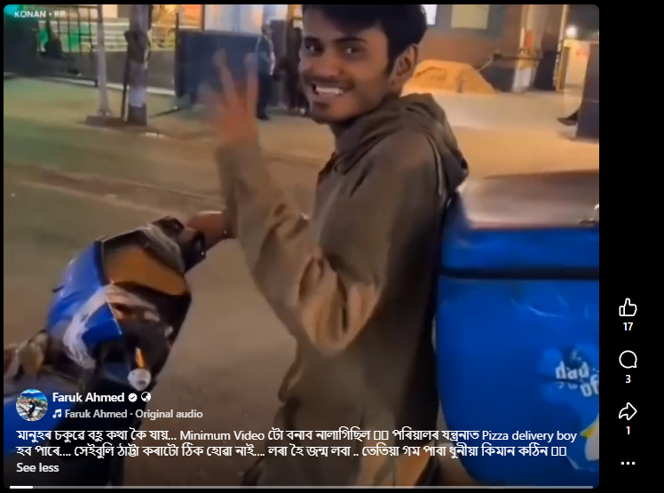 শেহতীয়াকৈ অসমৰ একাধিক ফেচবুক ব্যৱহাৰকাৰীয়ে এটা ভিডিঅ’ শ্বেয়াৰ কৰি দাবী কৰিছে যে ভিডিঅ’টো সত্য। দেখা গৈছে যে এগৰাকী যুৱতীয়ে তেওঁৰ স্কুলীয়া সহপাঠীক এজন পিজ্জা ডেলিভাৰী বয় হিচাপে বাটত লগ পায় আৰু কয় যে তেওঁ ৩০ বছৰীয়া হৈছে আৰু এতিয়া পিজ্জা ডেলিভাৰী বয় হিচাপে কাম কৰি আছে। স্কুলীয়া দিনত সেই যুৱকজনে এই যুৱতীগৰাকীসহিতে অন্য সহপাঠীক প্ৰেৰণামূলক ৰীল প্ৰেৰণ কৰিছিল আৰু আজি নিজেই এইধৰণ কাম কৰি আছে। তেওঁ তেওঁৰ অন্য বন্ধু বান্ধৱীকো সেই দৃশ্যটো প্ৰেৰণ কৰিব বুলি ভিডিঅ’টোত কোৱা শুনা গৈছে।