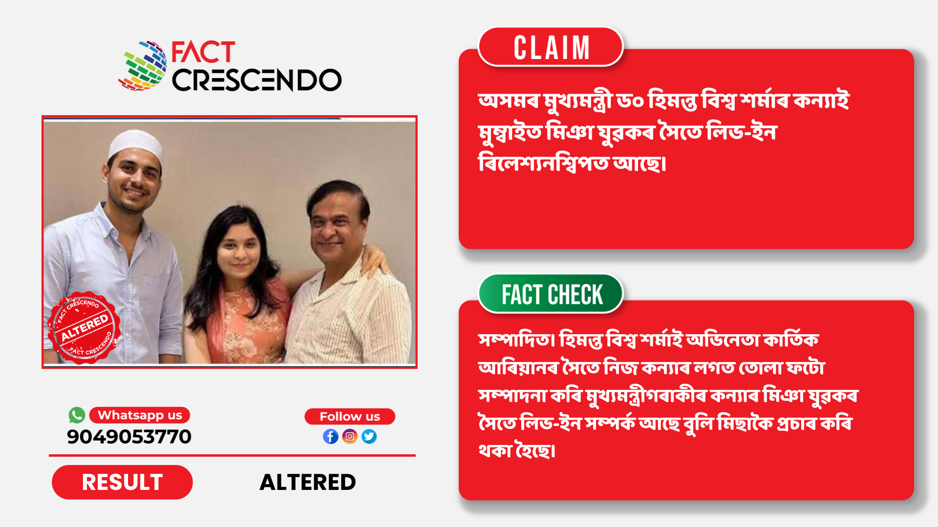 ইয়াৰ পৰাই স্পষ্ট হৈ পৰিল যে যোৱা ৫ চেপ্তেম্বৰ ২০২৫ত অসমৰ মুখ্যমন্ত্ৰী ড০ হিমন্ত বিশ্ব শৰ্মাই অভিনেতা কাৰ্তিক আৰিয়ানৰ সৈতে নিজ কন্যাৰ লগত মুম্বাইত তোলা ফটো এখনকে সম্পাদনা কৰি মুখ্যমন্ত্ৰীগৰাকীৰ কন্যাৰ মিঞা যুৱকৰ সৈতে লিভ-ইন সম্পৰ্ক আছে বুলি মিছাকৈ প্ৰচাৰ কৰি থকা হৈছে।