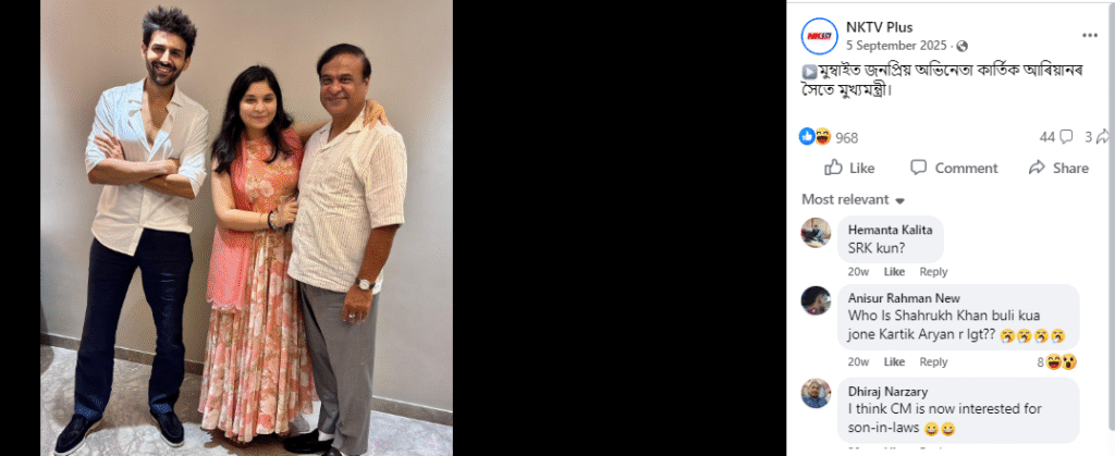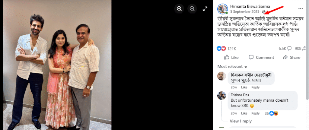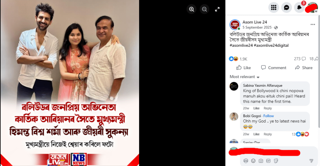 তাৰে এটা বাতৰিত আমি পালোঁ যে মুখ্যমন্ত্ৰীগৰাকীয়ে নিজেই সেই ফটোখন শ্বেয়াৰ কৰিছিল। তাৰ পাছতেই আমি অসমৰ মুখ্যমন্ত্ৰী ড০ হিমন্ত বিশ্ব শৰ্মাৰ সামাজিক মাধ্যমত সেই ফটোখনৰ সন্ধান কৰিলোঁ আৰু ২০২৫ৰ ৫ চেপ্তেম্বৰত তেখেতে সেই ফটোখন শ্বেয়াৰ কৰা আমি দেখিলোঁ। পোষ্টটোত তেখেতে লিখিছিল- জীয়ৰী সুকন্যাৰ সৈতে আজি মুম্বাইত বৰ্তমান সময়ৰ জনপ্ৰিয় অভিনেতা কাৰ্তিক আৰিয়ানক লগ পাওঁ৷ সময়ছোৱাত প্ৰতিভাৱান অভিনেতাগৰাকীক সুন্দৰ অভিনয় যাত্ৰাৰ বাবে শুভেচ্ছা জ্ঞাপন কৰোঁ৷