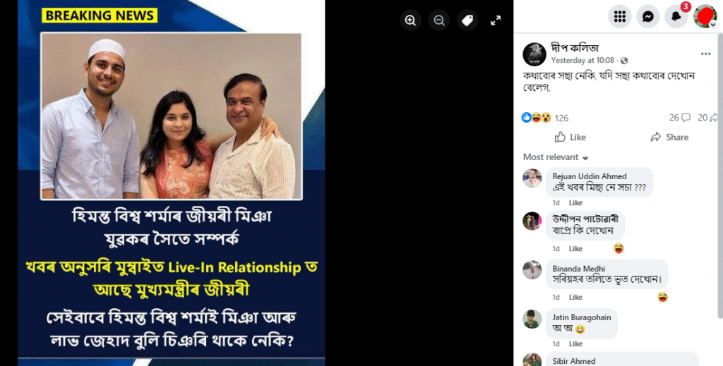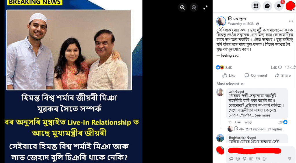 শেহতীয়াকৈ অসমৰ একাধিক ফেচবুক ব্যৱহাৰকাৰীয়ে এখন বিশেষ ফটো আপলোড কৰি দাবী কৰিছে যে অসমৰ মুখ্যমন্ত্ৰী ড০ হিমন্ত বিশ্ব শৰ্মাৰ কন্যাৰ মিঞা যুৱকৰ সৈতে সম্পৰ্ক আছে আৰু তেওঁ মুম্বাইত সেই যুৱকৰ সৈতে লিভ-ইন ৰিলেশ্বনশ্বিপত আছে। ফটোখনত আমি দেখা পাওঁ মুখ্যমন্ত্ৰী ড০ শৰ্মা আৰু তেওঁৰ কন্যাৰ সৈতে এগৰাকী ইছলামধৰ্মী টুপি পৰিহিত যুৱক।