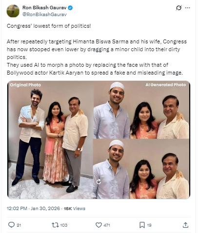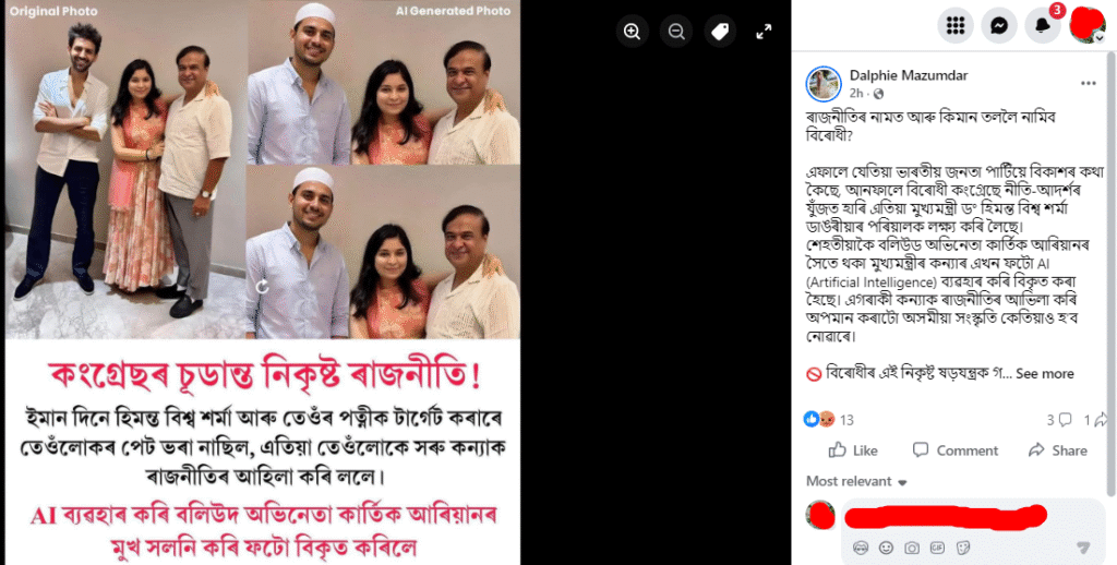 ইয়াৰ পাছত আমি ফেচবুকত আন এগৰাকী ব্যৱহাৰকাৰীয়ে একেদৰেই কাৰ্তিক আৰিয়ানৰ সৈতে থকা ফটোখনৰ লগতে ভাইৰেল ফটোখনো আপলোড কৰি সেয়া কংগ্ৰেছৰ নিকৃষ্ট ৰাজনীতি বুলি অভিহিত কৰি পোষ্ট কৰিছে। লিখিছে- ৰাজনীতিৰ নামত আৰু কিমান তললৈ নামিব বিৰোধী? এফালে যেতিয়া ভাৰতীয় জনতা পাৰ্টিয়ে বিকাশৰ কথা কৈছে, আনফালে বিৰোধী কংগ্ৰেছে নীতি-আদৰ্শৰ যুঁজত হাৰি এতিয়া মুখ্যমন্ত্ৰী ড° হিমন্ত বিশ্ব শৰ্মা ডাঙৰীয়াৰ পৰিয়ালক লক্ষ্য কৰি লৈছে। শেহতীয়াকৈ বলিউড অভিনেতা কাৰ্তিক আৰিয়ানৰ সৈতে থকা মুখ্যমন্ত্ৰীৰ কন্যাৰ এখন ফটো AI (Artificial Intelligence) ব্যৱহাৰ কৰি বিকৃত কৰা হৈছে। এগৰাকী কন্যাক ৰাজনীতিৰ আভিলা কৰি অপমান কৰাটো অসমীয়া সংস্কৃতি কেতিয়াও হ’ব নোৱাৰে।