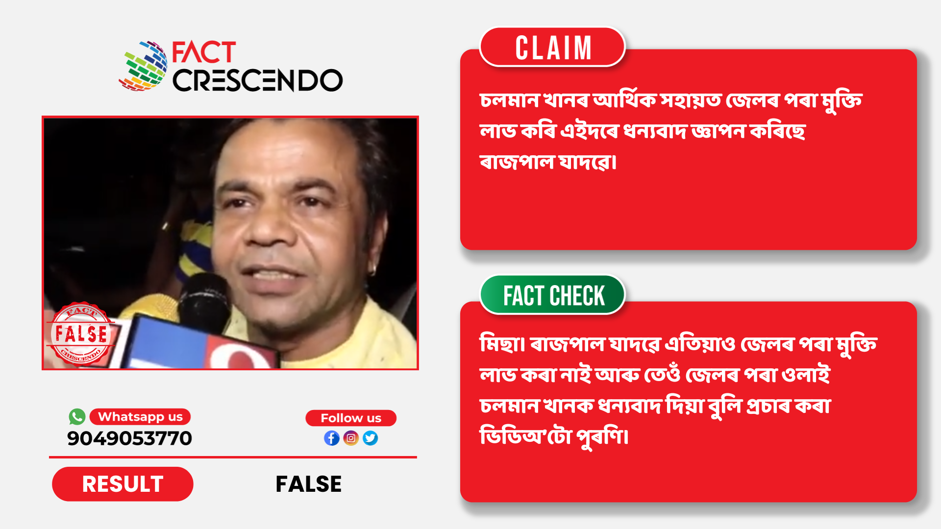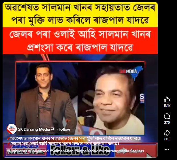 শেহতীয়াকৈ অসমৰ বিভিন্ন ফেচবুক পেজ আৰু ব্যৱহাৰকাৰীয়ে ৰাজপাল যাদৱৰ এটা ভিডিঅ’ আপলোড কৰি দাবী কৰিছে যে অলপতে অৰ্থনৈতিক অপৰাধত জেললৈ যোৱা ৰাজপাল যাদৱে চলমান খানৰ আৰ্থিক সহায়ৰ পাছত জেলৰ পৰা ওলাই আহি চলমান খানক ধন্যবাদ জ্ঞাপন কৰিছে।