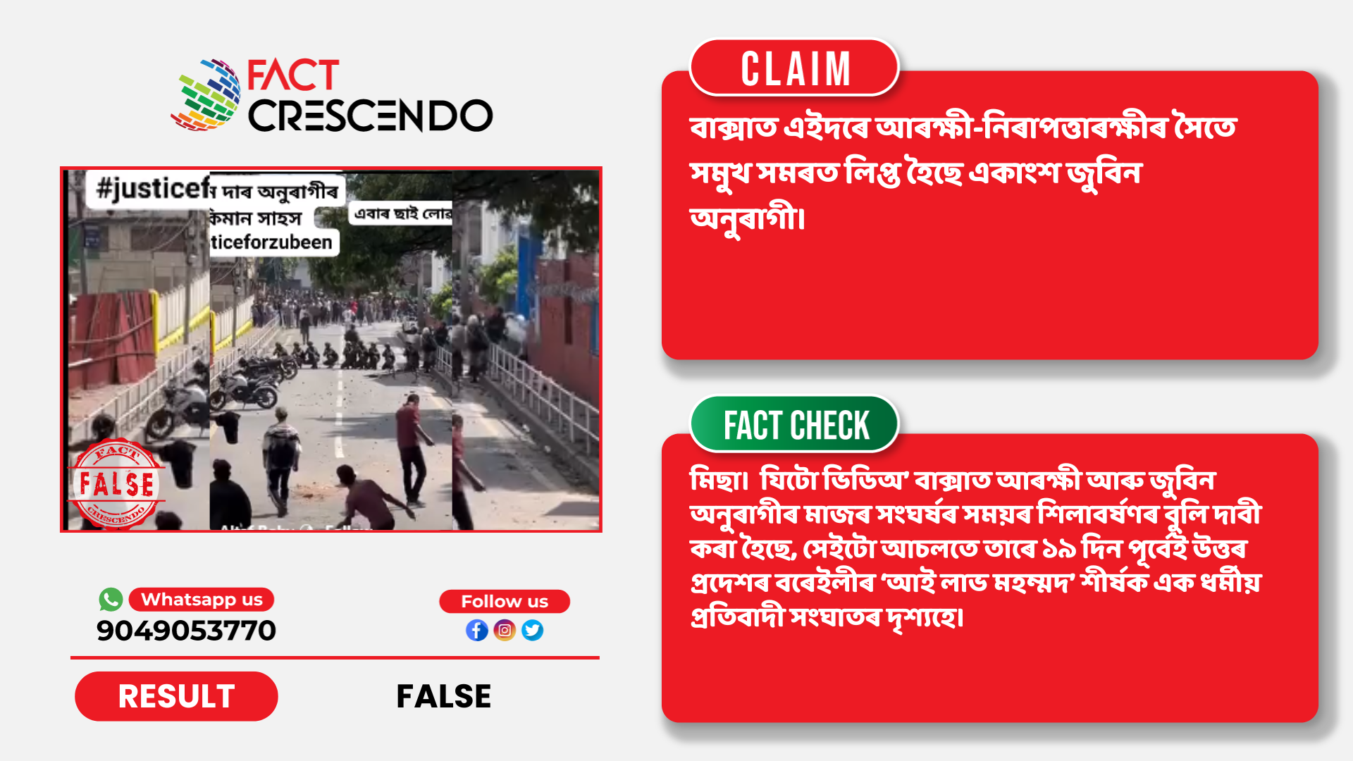 ফেক্ট ক্ৰেছেণ্ডো অসমীয়াৰ অনুসন্ধানত এই কথা নিশ্চিত হৈছে দাবীটো মিছা। যিটো ভিডিঅ’ বাক্সাত আৰক্ষী আৰু জুবিন অনুৰাগীৰ মাজৰ সংঘৰ্ষৰ সময়ৰ শিলাবৰ্ষণৰ বুলি দাবী কৰা হৈছে, সেইটো আচলতে তাৰে ১৯ দিন পূৰ্বেইউত্তৰ প্ৰদেশৰ বৰেইলীৰ ‘আই লাভ মহম্মদ’ শীৰ্ষক এক ধৰ্মীয় প্ৰতিবাদী সংঘাতৰ দৃশ্যহে।