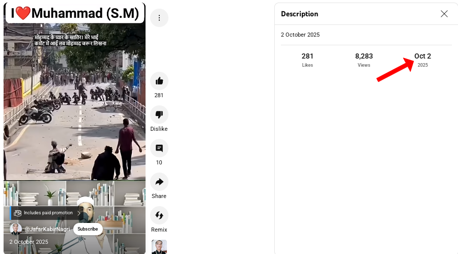 ইয়াৰ পৰাই আমি নিশ্চিত হ’লোঁ যে যিটো ভিডিঅ’ ১৫ অক্টোবৰ ২০২৫ত বাক্সাত সংঘটিত হোৱা আৰক্ষী আৰু জুবিন অনুৰাগীৰ মাজৰ সংঘৰ্ষৰ সময়ৰ শিলাবৰ্ষণৰ বুলি দাবী কৰা হৈছে, সেইটো আচলতে তাৰে ১৯ দিন পূৰ্বেই ২৬ চেপ্তেম্বৰ ২০২৫ত উত্তৰ প্ৰদেশৰ বৰেইলীৰ ‘আই লাভ মহম্মদ’ শীৰ্ষক এক ধৰ্মীয় প্ৰতিবাদী সংঘাতৰ দৃশ্যহে।