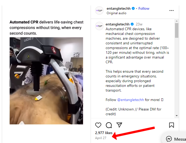 অনুসন্ধানৰ আৰম্ভণীতে আমি ভিডিঅ’টোৰ কী-ফ্ৰেমৰ ৰিভাৰ্ছ ইমেজ ছাৰ্চ কৰি চালোঁ। তেতিয়া প্ৰথমে আমি যোৱা ১২ এপ্ৰিল ২০২৫ত(জুবিন গাৰ্গৰ দেহাৱসানৰ প্ৰায় ৫ মাহ পূৰ্বেই) ইনষ্টাগ্ৰামত এই ভিডিঅ’টো দেখা পালোঁ। তাত লিখা আছিল-STRONG IMAGES!!! THIS ROBOT ALLOWS US TO PERFORM CARDIAC MASSAGE DURING A CARDIORESPIRATORY ARREST!! তাৰ পৰাই আমি প্ৰমাণ পালোঁ যে ভিডিঅ’টো পুৰণি।