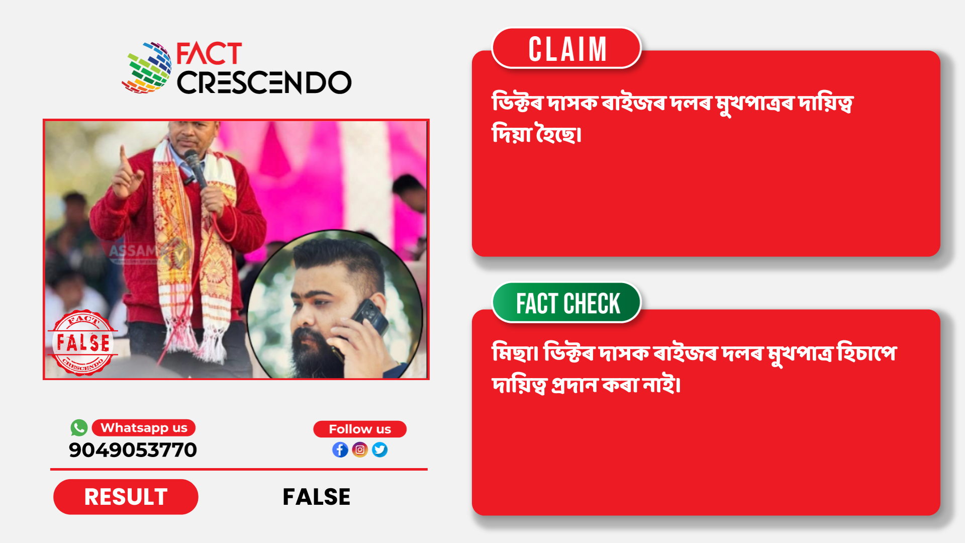 ফেক্ট ক্ৰেছেণ্ডো অসমীয়াৰ অনুসন্ধানত এই কথা নিশ্চিত হৈছে যে দাবীটো মিছা। ভিক্টৰ দাসক ৰাইজৰ দলৰ মুখপাত্ৰ হিচাপে দায়িত্ব প্ৰদান কৰা নাই।