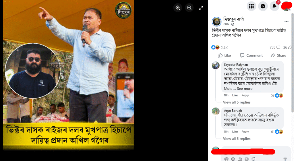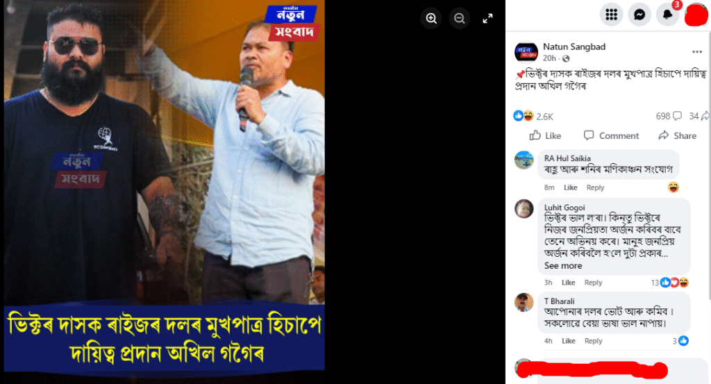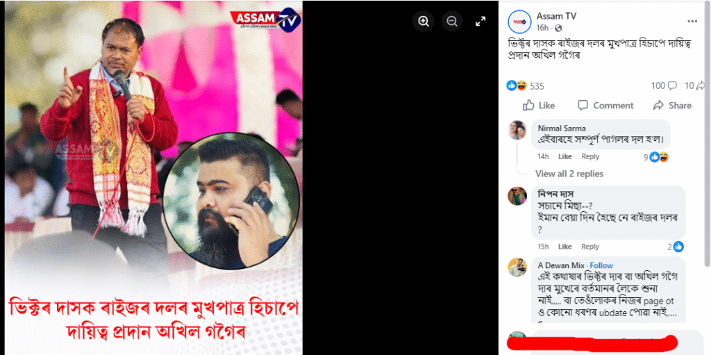 ইয়াৰ পৰাই নিশ্চিত হয় যে অসমৰ কিছুমান ফেচবুক পেজত ভিক্টৰ দাসক ৰাইজৰ দলৰ মুখপাত্ৰ হিচাপে নিযুক্তি বা দায়িত্ব প্ৰদান কৰা কথাটো মিছা।