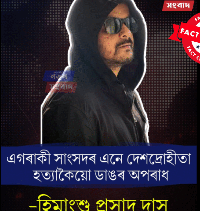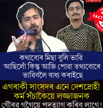 শেহতীয়াকৈ অসমৰ এটা ফেচবুক পেজত এটা পোষ্ট কৰা হৈছে। পোষ্টটোত যুৱ বক্তা ত্ৰিদিব ভাগৱতীৰ ফটো ব্যৱহাৰ কৰি কিছু মন্তব্য লিখা হৈছে। দাবী কৰা হৈছে সাংসদ গৌৰৱ গগৈ সন্দৰ্ভত ত্ৰিদিব ভাগৱতীয়ে সেই মন্তব্য কৰিছে। কেপছনত লিখিছে- এগৰাকী সাংসদৰ এনে দেশদ্ৰোহী কৰ্ম সঁচাকৈয়ে লজ্জাজনক’। যুৱ লেখক ত্ৰিদিপ ভাগৱতীৰ মন্তব্য। ফটোখনত টেক্সট ওভাৰলে’ কৰি লিখা হৈছে- কথাবোৰ মিছা […]