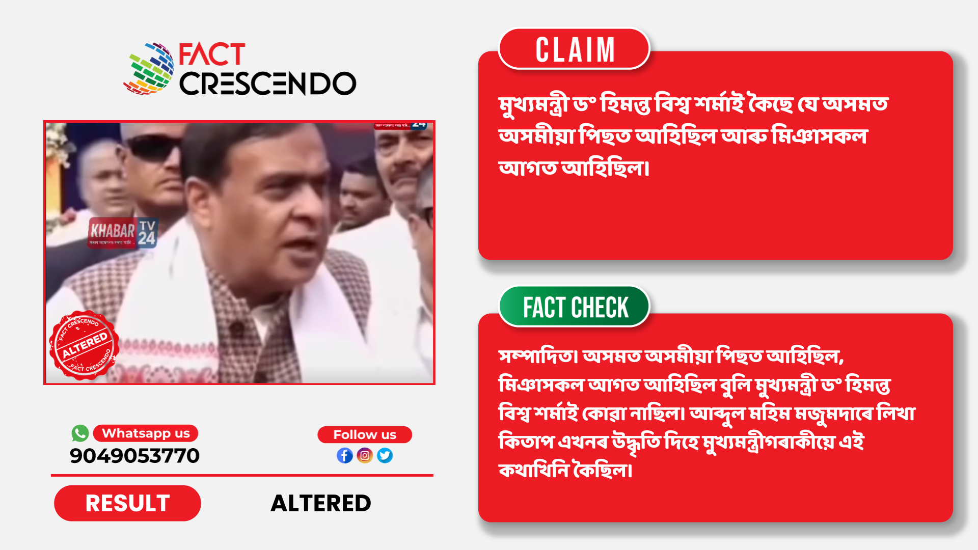 অসমত অসমীয়া পিছত আহিছিল, মিঞাসকল আগত আহিছিল বুলি মুখ্যমন্ত্ৰী হিমন্ত বিশ্ব শৰ্মাই কৈছে নেকি? পঢ়ক আমাৰ এই ফেক্ট চেক।
