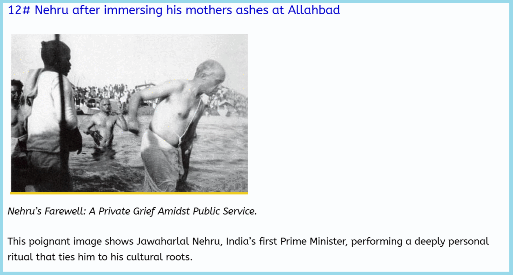 ইয়াৰ পাছত আমাৰ সন্ধানত আগবাঢ়ি গৈ আমি একেখন ফটোকে এটা ৱেবছাইটত আপলোড কৰা দেখিলোঁ, য’ত লিখা আছিল, “নেহৰুৱে এলাহাবাদত মাকৰ অস্থি বিসৰ্জন দিয়াৰ পাছত”। ফটোখনৰ বৰ্ণনাত লিখা কথাখিনিৰ ভাবানুবাদঃ “নেহৰুৰ বিদায়: ৰাজহুৱা সেৱাৰ মাজতে এক ব্যক্তিগত শোক। এই মৰ্মান্তিক ছবিখনত ভাৰতৰ প্ৰথম প্ৰধানমন্ত্ৰী জৱাহৰলাল নেহৰুৱে তেওঁক সংস্কাৰৰ শিপাৰ সৈতে বান্ধি ৰখা এক গভীৰ ব্যক্তিগত পৰম্পৰা ৰক্ষা কৰা দেখা গৈছে।”