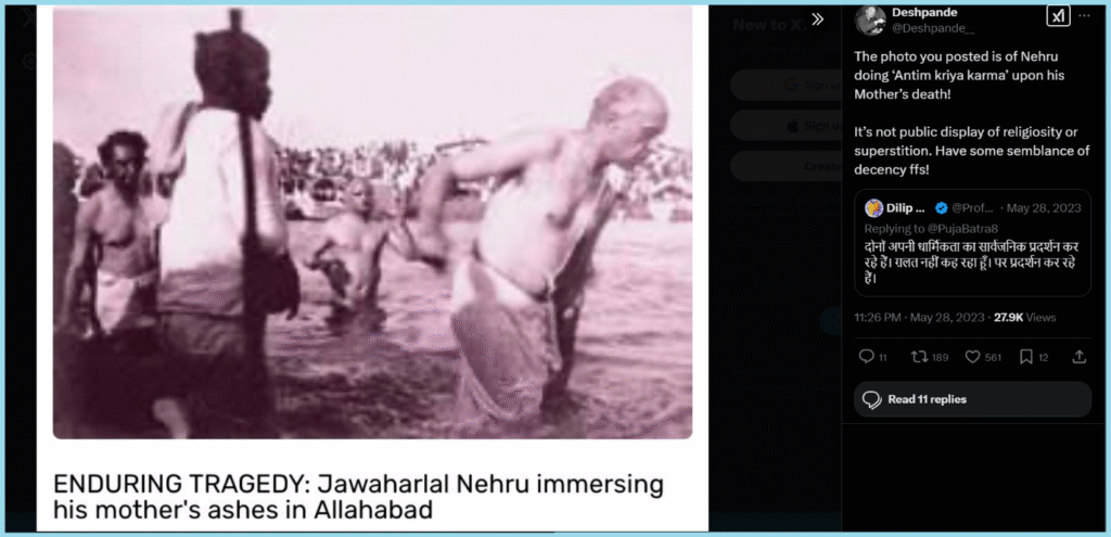 ইয়াৰ পাছত আমি ভাইৰেল ফটোখনৰ ৰিভাৰ্ছ ইমেজ ছাৰ্চ কৰিলোঁ। তেতিয়া ২০২৩ চনৰ ২৮ মে’ৰ এটা টুইট পালোঁ। সেই টুইটটোত উল্লিখিত ফটোখন আপলোড কৰা হৈছিল আৰু তাত থকা কেপছনটোৰ ভাবানুবাদ আছিলঃ- “আপুনি পোষ্ট কৰা ফটোখন নেহৰুৱে মাকৰ মৃত্যুৰ পাছত কৰা ‘অন্তিম ক্ৰিয়া কৰ্ম’ৰ সময়ৰ! এয়া ধৰ্ম বা অন্ধবিশ্বাসৰ ৰাজহুৱা প্ৰদৰ্শন নহয়। শালীনতাৰ কিছু আভাস ৰক্ষা কৰক!”