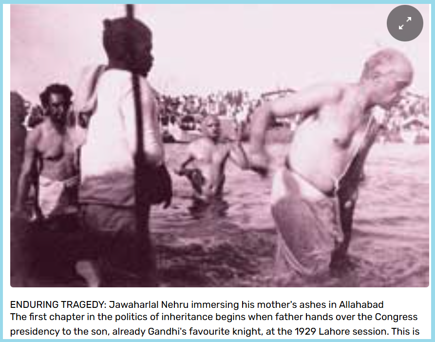 সেই ফটোখনত লিখা আছিল “ENDURING TRAGEDY: Jawaharlal Nehru immersing his mother’s ashes in Allahabad. ( চিৰস্থায়ী শোকঃ জৱাহৰলাল নেহৰুৱে এলাহাবাদত মাকৰ অস্থি বিসৰ্জন কৰাৰ সময়ত”।)