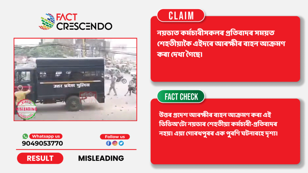 আমাৰ অনুসন্ধানৰ পৰা আমি ক’ব পাৰোঁ যে ভাইৰেল দাবীটো বিভ্ৰান্তিকৰ। উত্তৰ প্ৰদেশ আৰক্ষীৰ বাহন আক্ৰমণ কৰা এই ভিডিঅ’টো নয়ডাৰ শেহতীয়া কৰ্মচাৰী-প্ৰতিবাদৰ নহয়। এয়া গোৰখপুৰৰ এক পুৰণি ঘটনাৰহে দৃশ্য।