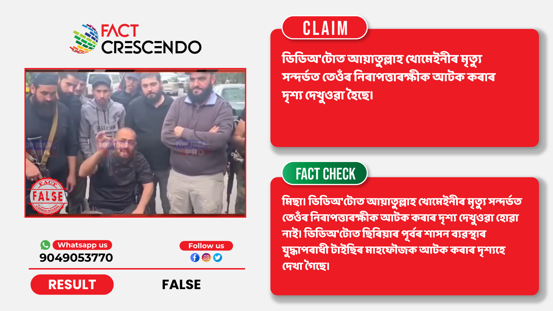 আমাৰ অনুসন্ধানৰ পৰা আমি ক’ব পাৰোঁ যে ভাইৰেল দাবীটো মিছা। ভিডিঅ’টোত আয়াতুল্লাহ খোমেইনীৰ মৃত্যু সন্দৰ্ভত তেওঁৰ নিৰাপত্তাৰক্ষীক আটক কৰাৰ দৃশ্য দেখুওৱা হোৱা নাই। ভিডিঅ’টোত ছিৰিয়াৰ পূৰ্বৰ শাসন ব্যৱস্থাৰ যুদ্ধাপৰাধী টাইছিৰ মাহফৌজক আটক কৰাৰ দৃশ্যহে দেখা গৈছে।