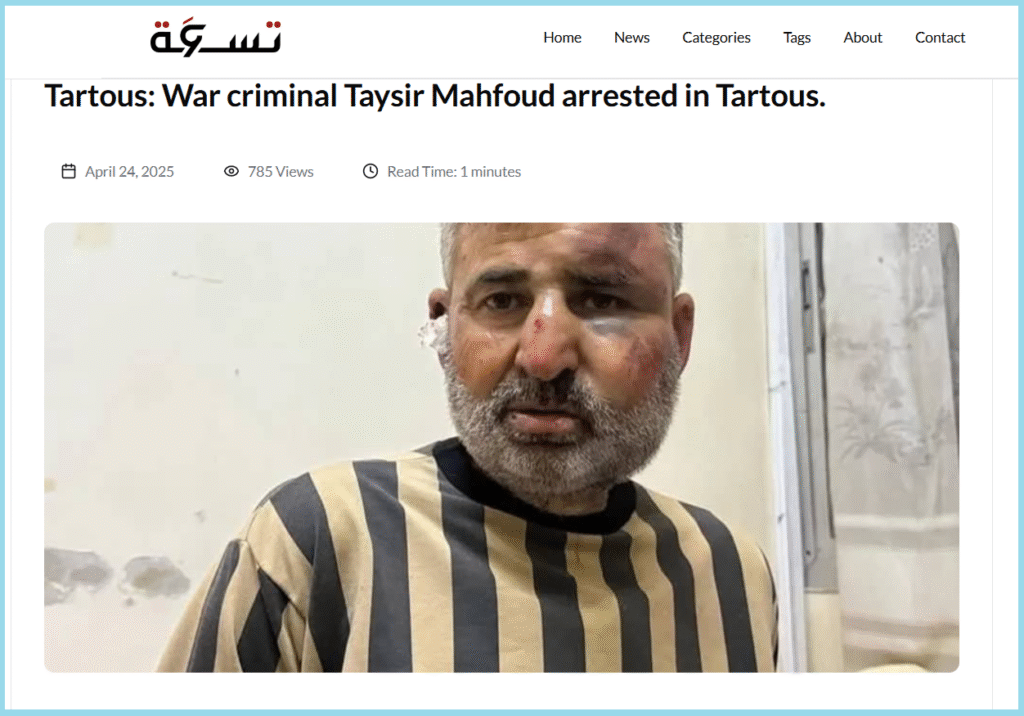 প্ৰতিবেদনৰ অসমীয়া অনুবাদ এনেধৰণৰ, “ছিৰিয়াৰ স্বৰাজ মন্ত্ৰালয়ে টাৰ্টাছ চহৰত এক নিৰ্দিষ্ট নিৰাপত্তা অভিযানৰ সময়ত পূৰ্বৰ ছিৰিয়াৰ শাসন ব্যৱস্থাৰ অন্যতম যুদ্ধাপৰাধী টাইছিৰ মাহফৌজক গ্ৰেপ্তাৰ কৰাৰ কথা ঘোষণা কৰে। এই অঞ্চলত তেওঁৰ উপস্থিতিৰ ইংগিত দিয়া চোৰাংচোৱা তথ্যৰ ভিত্তিত এই কথা প্ৰকাশ কৰা হৈছিল।