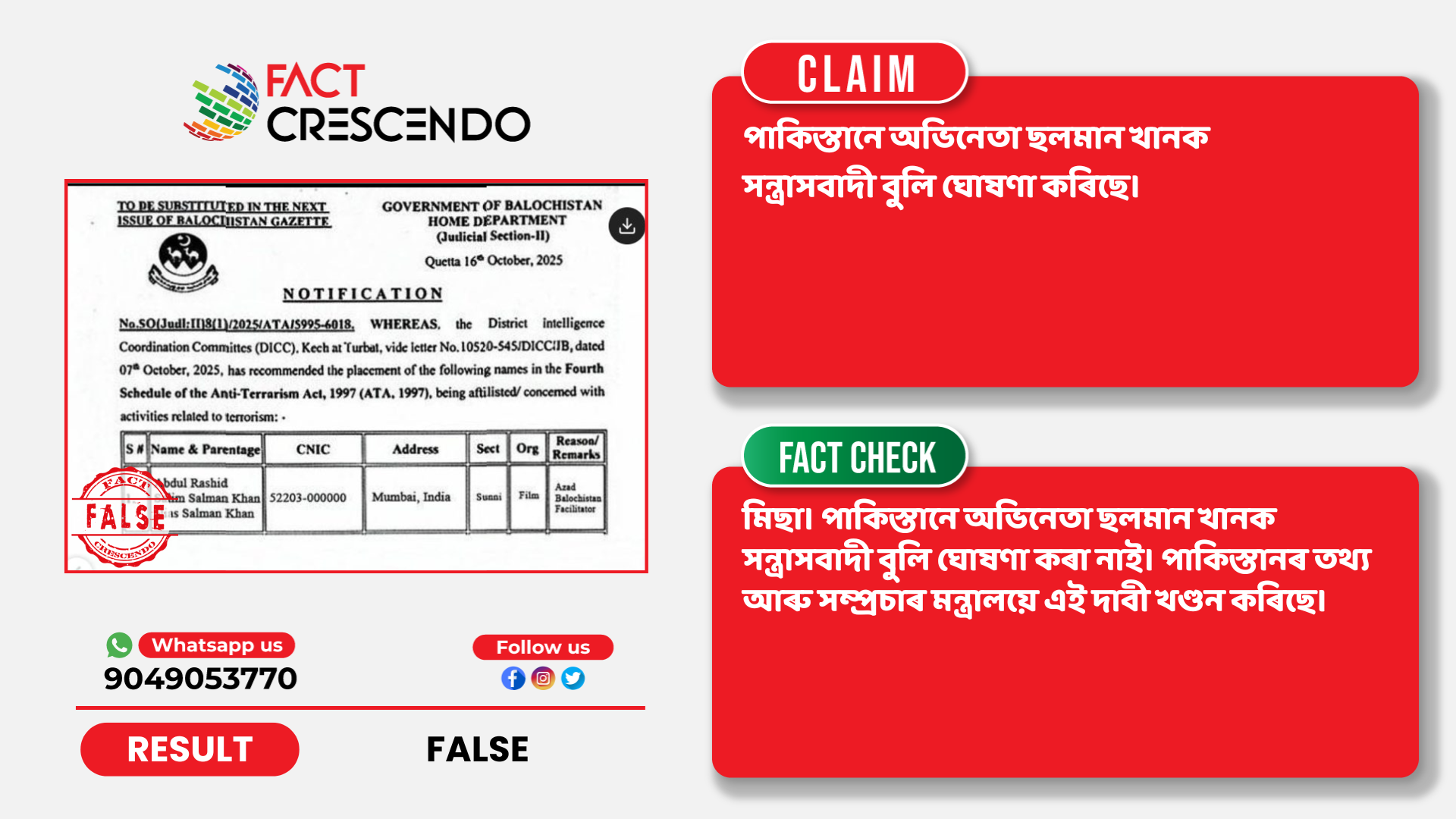 আমাৰ অনুসন্ধানৰ পৰা আমি ক’ব পাৰোঁ যে ভাইৰেল দাবীটো মিছা। পাকিস্তানে অভিনেতা ছলমান খানক সন্ত্ৰাসবাদী বুলি ঘোষণা কৰা নাই। পাকিস্তানৰ তথ্য আৰু সম্প্ৰচাৰ মন্ত্ৰালয়ে এই দাবী খণ্ডন কৰিছে।