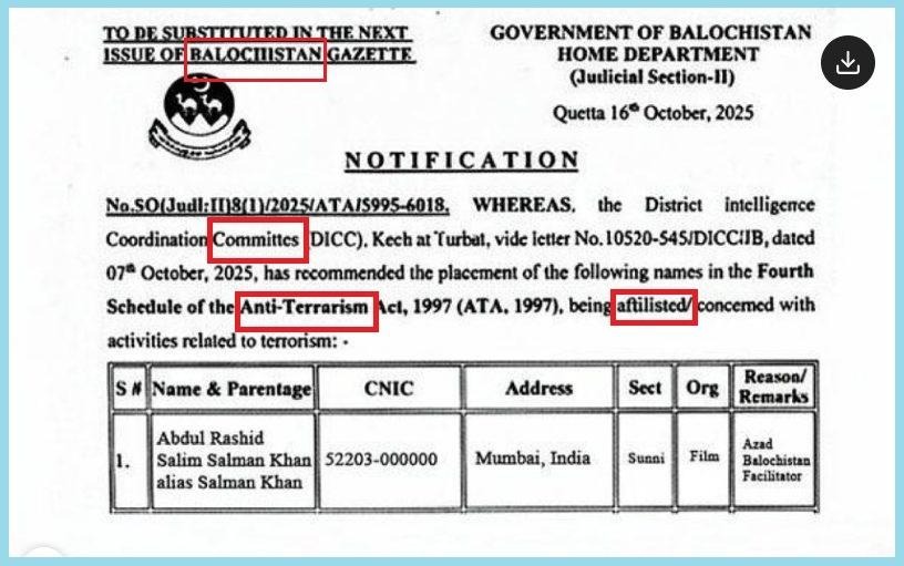কিছুদিন পূৰ্বে ছৌদি আৰৱৰ ৰিয়াধত অনুষ্ঠিত “জয় ফ’ৰাম ২০২৫” অনুষ্ঠানত শ্বাহৰুখ খান আৰু আমিৰ খানকে ধৰি বলীউডৰ আন ছুপাৰষ্টাৰৰ সৈতে অংশগ্ৰহণ কৰি অভিনেতা ছলমান খানে নিজৰ ভাষণত বেলুচিস্তান আৰু পাকিস্তানৰ কথা পৃথকে পৃথকে উল্লেখ কৰাত বিতৰ্কৰ সৃষ্টি হৈছিল। তেওঁ কৈছিল, “এতিয়াই যদি আপুনি হিন্দী ছবি এখন নিৰ্মাণ কৰি ইয়াত (ছৌদি আৰৱত) মুক্তি দিয়ে তেন্তে ই ছুপাৰহিট হ’ব। যদি আপুনি তামিল, তেলেগু, বা মালয়ালম ছবি এখন নিৰ্মাণ কৰে তেন্তে ই শ শ কোটি টকাৰ ব্যৱসায় কৰিব কাৰণ ইয়ালৈ আন দেশৰ পৰা ইমানবোৰ মানুহ আহিছে। বেলুচিস্তানৰ মানুহ আছে, আফগানিস্তানৰ মানুহ আছে, পাকিস্তানৰ মানুহ আছে… ইয়াত সকলোৱে কাম কৰি আছে।” এই পটভূমিত ছ’চিয়েল মিডিয়াত এটা পোষ্ট ভাইৰেল হৈছে য’ত দাবী কৰা হৈছিল যে পাকিস্তানে ছলমান খানক তেওঁৰ বেলুচিস্তান মন্তব্যৰ পিছত সন্ত্ৰাসবাদী ঘোষণা কৰিছে।