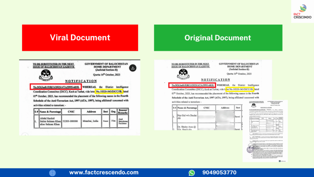ভাইৰেল নথিখনৰ ৰিভাৰ্ছ ইমেজ ছাৰ্চ কৰি আমি “Baloch Women Forum” নামৰ এক্স হেণ্ডলত ভাইৰেল নথিখনৰ সৈতে একেই ছিৰিয়েল নম্বৰ আৰু চিঠি নম্বৰ থকা এখন নথি পালোঁ।