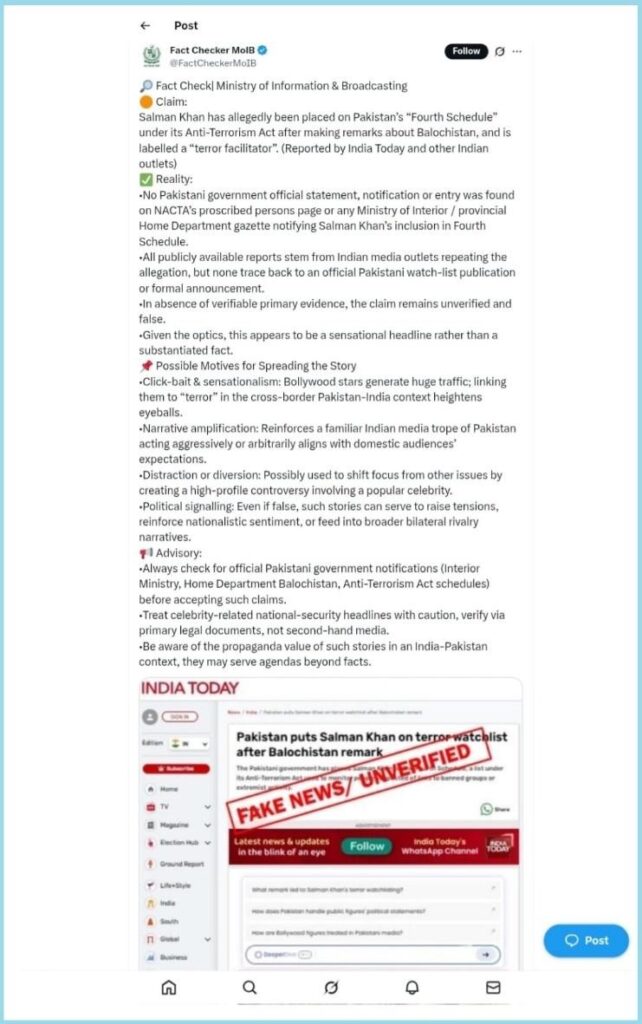 আমি পাকিস্তানৰ তথ্য আৰু সম্প্ৰচাৰ মন্ত্ৰালয়ৰ এক্স হেণ্ডেল পৰীক্ষা কৰিব পৰা নাছিলোঁ কাৰণ ভাৰতত আইনী দাবীৰ প্ৰতি সঁহাৰি জনাই ইয়াক বন্ধ ৰখা হৈছে। আমাৰ শ্ৰীলংকাৰ দলৰ সহায়ত আমি পাকিস্তানৰ তথ্য আৰু সম্প্ৰচাৰ মন্ত্ৰালয়ৰ এক্স হেণ্ডেলটো চাব পাৰিলোঁ আৰু ২০২৫ চনৰ ২৬ অক্টোবৰত কৰা টুইটটো পালোঁ। টুইটত স্পষ্টভাৱে উল্লেখ কৰা হৈছে যে ছলমান খানক পাকিস্তানে সন্ত্ৰাসবাদী বুলি ঘোষণা কৰা দাবীটো ভিত্তিহীন আৰু মিছা।