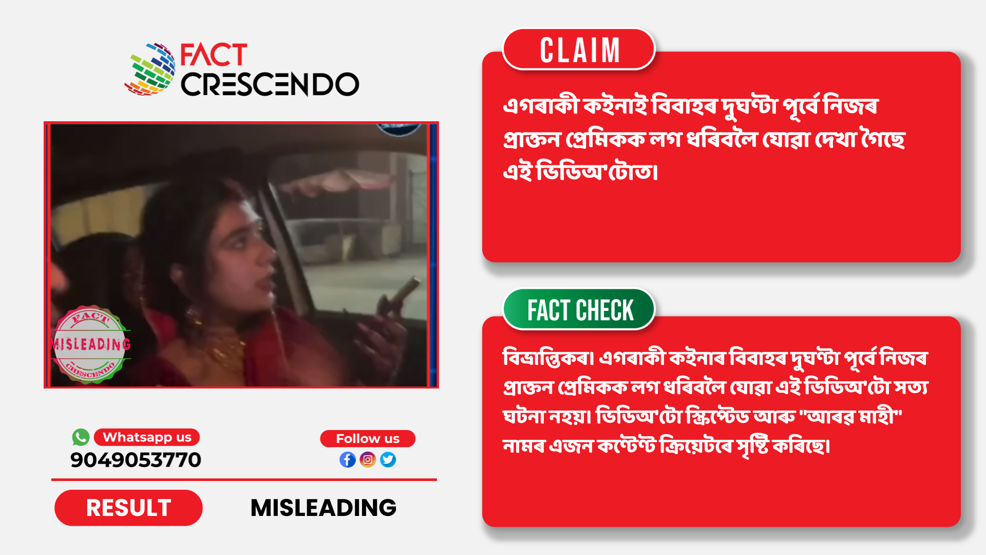 আমাৰ অনুসন্ধানৰ পৰা আমি ক’ব পাৰোঁ যে ভাইৰেল দাবীটো বিভ্ৰান্তিকৰ। এগৰাকী কইনাৰ বিবাহৰ দুঘণ্টা পূৰ্বে নিজৰ প্ৰাক্তন প্ৰেমিকক লগ ধৰিবলৈ যোৱা এই ভিডিঅ’টো সত্য ঘটনা নহয়। ভিডিঅ’টো স্ক্ৰিপ্টেড আৰু “আৰৱ মাহী” নামৰ এজন কণ্টেণ্ট ক্ৰিয়েটৰে সৃষ্টি কৰিছে।