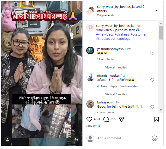 অধিক তদন্তৰ পাছত আমি @carry_wear_by_besties_ks ৰ হেণ্ডেলটো পালোঁ। আমি এই হেণ্ডেলটোত আপলোড কৰা একেটা ভিডিঅ’ৰ একাধিক সংস্কৰণ পালোঁ। হেণ্ডেলটোত শ্বুটিঙৰ বিহাইণ্ড দ্য চিন ক্লিপ এটাও শ্বেয়াৰ কৰিছিল, য’ত দুয়োগৰাকী মহিলাই অভিনয় কৰি থকা আৰু হাঁহি থকা দেখা গৈছিল।