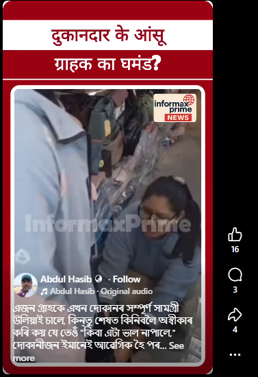 শেহতীয়াকৈ অসমৰ এগৰাকী ফেচবুক ব্যৱহাৰকাৰীয়ে এটা বিশেষ ভিডিঅ’ আপলোড কৰা দেখা গৈছে। ভিডিঅ’টোত আমি দেখোঁ যে এগৰাকী যুৱতী দোকানীয়ে তেওঁৰ দোকানৰ পৰা এগৰাকী গ্ৰাহকে একো নিকিনাকৈ যাবলৈ ওলাওতে কান্দি কান্দি ভৰিত ধৰিছিল। ব্যৱহাৰকাৰীগৰাকীয়ে এইটো সত্য ঘটনা বুলি দাবী কৰিছে।