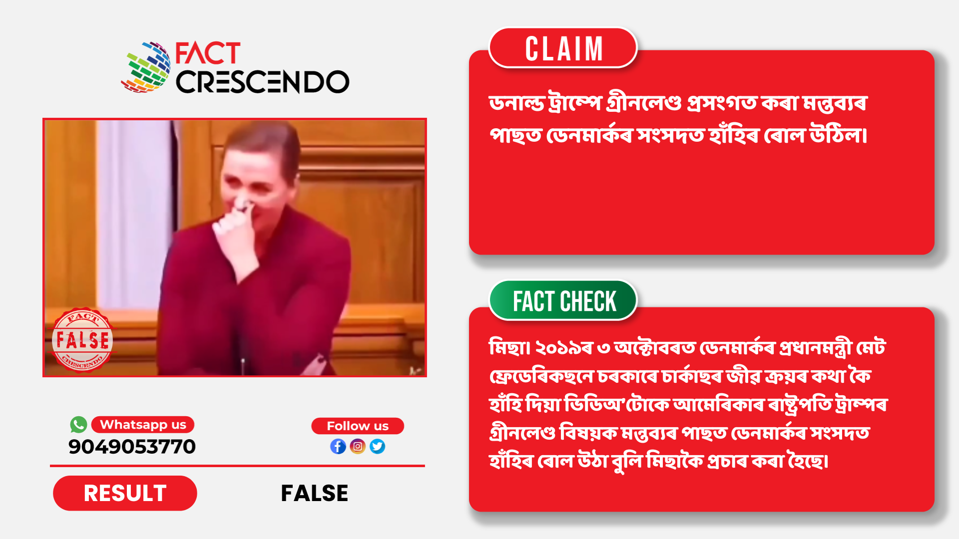 ফেক্ট ক্ৰেছেণ্ডো অসমীয়াৰ অনুসন্ধানত এই কথা নিশ্চিত হৈছে যে দাবীটো মিছা। ২০১৯ৰ ৩ অক্টোবৰত ডেনমাৰ্কৰ প্ৰধানমন্ত্ৰী মেট ফ্ৰেডেৰিকছনে সংসদৰ শৰৎকালীন অধিৱেশনৰ আৰম্ভণিতে চৰকাৰে চাৰ্কাছৰ জীৱ ক্ৰয় কৰা প্ৰসংগ উল্লেখ কৰোতে হাঁহি ৰখাব নোৱৰা হোৱা ভিডিঅ’টোকে ২০২৬ৰ জানুৱাৰীত আমেৰিকাৰ ৰাষ্ট্ৰপতি ট্ৰাম্পৰ গ্ৰীনলেণ্ড বিষয়ক মন্তব্যৰ পাছত ডেনমাৰ্কৰ সংসদত হাঁহিৰ ৰোল উঠা বুলি মিছা দাবীৰে প্ৰচাৰ কৰা হৈছে।