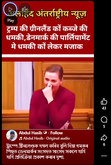 শেহতীয়াকৈ অসমৰ এগৰাকী ফেচবুক ব্যৱহাৰকাৰীয়ে এটা ভিডিঅ’ আপলোড কৰি দাবী কৰিছে যে সেয়া আমেৰিকাৰ ৰাষ্ট্ৰপতি ডনাল্ড ট্ৰাম্পে গ্রীনলেণ্ডক দখল কৰিব বুলি দিয়া ধমকৰ পাছত ডেনমাৰ্কৰ সংসদত সাংসদ সকলে হাঁহি হাঁহি প্ৰতিক্ৰিয়া প্ৰকাশ কৰাৰ দৃশ্য। ভিডিঅ’টোত দেখা গৈছে যে ডেনমাৰ্কৰ প্ৰধানমন্ত্ৰী মেট ফ্ৰেডেৰিকছনে কোনো এটা কথাত নিজৰ হাঁহি ৰখাব পৰা নাই আৰু তাৰ পাছতে সংসদত বহি থকা অন্য সাংসদসকলেও উচ্চস্বৰে হাঁহিছে।