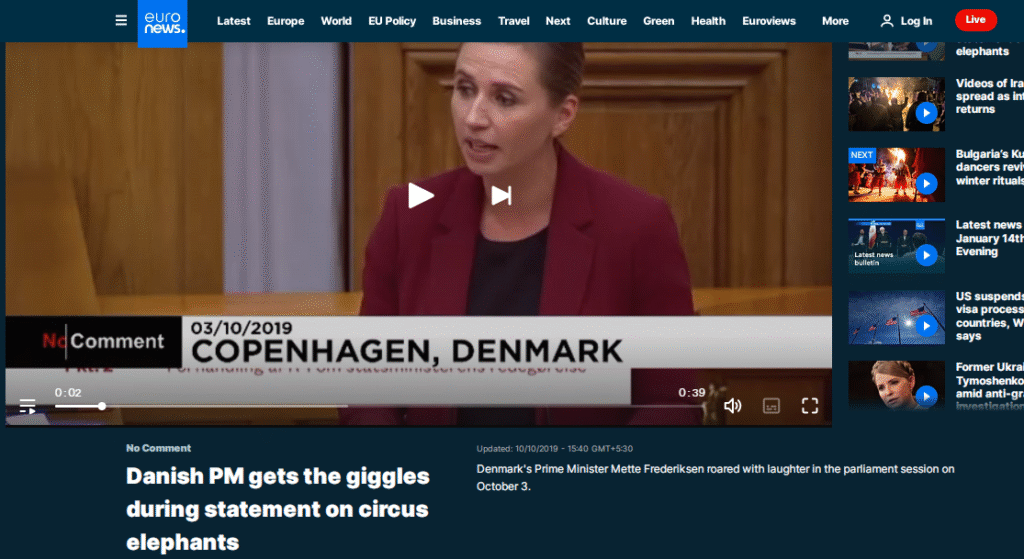 ইয়াৰ পাছত আমি আন্তঃৰাষ্ট্ৰীয় সংবাদ প্ৰতিষ্ঠান ইউৰো নিউজত এই ভিডিঅ”টো পালোঁ। ২০১৯ চনৰ ১০ অক্টোবৰত পৰিবেশন কৰা সেই বাতৰি মতে ডেনমাৰ্কৰ প্ৰধানমন্ত্ৰী মেট ফ্ৰেডেৰিকছনে ৩ অক্টোবৰত চাৰ্কাছৰ জন্তু বিষয়ক মন্তব্য কৰাৰ সময়ত এইদৰে সংসদত হাঁহি ৰখাব পৰা নাছিল।