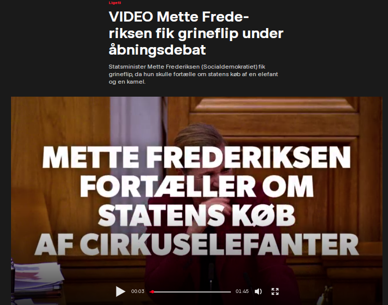 তাৰ পাছত আমি এই সম্পৰ্কে অধিক তথ্য আহৰণৰ চেষ্টা কৰোতে ডেনমাৰ্কৰ এক সংবাদ প্ৰতিষ্ঠানে ২০১৯ৰ ৭ অক্টোবৰত প্ৰকাশ কৰা এক বাতৰি লাভ কৰিলোঁ। তাত আমি ডেনমাৰ্কৰ প্ৰধানমন্ত্ৰীয়ে হাঁহি থকা ভিডিঅ’টোৰ এটা স্ক্ৰীণশ্বটো পালোঁ। বাতৰিটো মতে ডেনমাৰ্কৰ প্ৰধানমন্ত্ৰী মেট ফ্ৰেডেৰিকছনে স্থানীয় সংসদ ফ’কেটিঙক সম্বোধন কৰে। ফ্ৰেডেৰিকছনে সংসদৰ শৰৎকালীন অধিৱেশনৰ আৰম্ভণি কৰিছিল আৰু তেওঁৰ ভাষণত ৰাজ্যখনৰ বাজেট ব্যয়ৰ ৰূপৰেখা দাঙি ধৰিছিল। আন আন খৰচৰ লগতে চাৰ্কাছৰ জীৱ-জন্তু বিশেষকৈ চাৰিটা হাতী ক্ৰয় কৰাটোও সেই ভাষণত আছিল। উল্লেখযোগ্য যে তাৰ চাৰ্কাছৰ আৰু সেইবোৰ জীৱ ব্যৱহাৰ কৰাৰ অধিকাৰ নাছিল আৰু ৰাষ্ট্ৰই সেইবোৰ ক্ৰয় কৰিবলগীয়া হৈছিল। ডেনমাৰ্কৰ সংসদত দলসমূহৰ মাজত চাৰ্কাছত বিদেশী জীৱ-জন্তুৰ ব্যৱহাৰ নিষিদ্ধ কৰা চুক্তিত উপনীত হয় আৰু হাতীবোৰক কোৱাৰেণ্টাইন কৰা হৈছিল। সংশ্লিষ্ট আইনখন অক্টোবৰ মাহত ফ’কেটিঙে বিবেচনা কৰাৰ কথা আছিল আৰু ইয়াৰ মাজতে চৰকাৰে জীৱ-জন্তু ক্ৰয় কৰিছিল। তেতিয়াই হাতী আৰু উট ক্ৰয়ৰ প্ৰসংগটো ওলাওতে প্ৰধানমন্ত্ৰীয়ে হাঁহি ৰখাব নোৱৰাত আন সাংসদসকলেও একেলগে হাঁহি দিছিল।