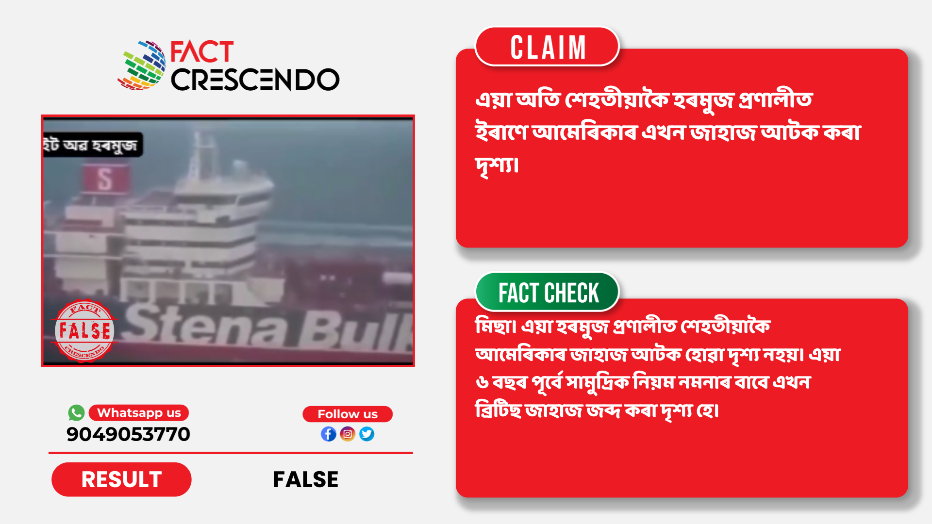 ইয়াৰ পৰাই প্ৰমাণ হয় যে যিটো ভিডিঅ’ অতি শেহতীয়াকৈ হৰমুজ প্ৰণালীত আমেৰিকাৰ জাহাজ জব্দ কৰা বুলি দাবী কৰি ভাইৰেল কৰা হৈছে, সেইটো আচলতে ৬ বছৰ পূৰ্বে হৰমুজত এখন ব্ৰিটিছ জাহাজক সামুদ্ৰিক নিয়ম নমনাৰ ফলত ইৰাণৰ ৰিভল্যুচনেৰী গাৰ্ডে কৰ্পছে জব্দ কৰা দৃশ্যহে।