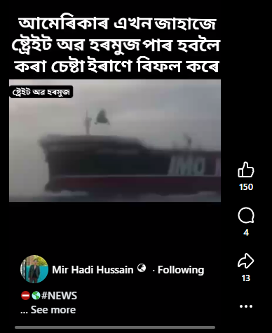 শেহতীয়াকৈ অসমৰ এটা ফেচবুক একাউণ্টত এটা ভিডিঅ’ আপলোড কৰি সেয়া ষ্ট্ৰেইট অৱ হৰমুজ পাৰ হ’বলৈ চেষ্টা কৰি ইৰাণৰ হাতত আটক হোৱা আমেৰিকাৰ এখন জাহাজৰ দৃশ্য বুলি দাবী কৰিছে। দৃশ্যটোত লিখিছে– আমেৰিকাই দাদাগিৰি চলালে ষ্ট্ৰেইট অৱ হৰমুজতো। ইৰাণৰ ওচৰত হাৰ মানি আটক হল জাহাজ-নাৱিক। ইৰাণে বলবৎ কৰা ট্ৰেনজিত কৰ নিদি বলপুৰ্বকভাৱে দাদাগিৰি দেখুৱাই পলাই যাবলৈ চেষ্টা কৰোতে ইৰাণৰ সেনাৰ হাতত আটক হল আমেৰিকাৰ জাহাজ-নাৱিক।