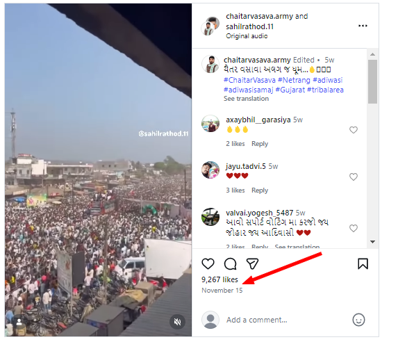 আমি আৰু অধিক সন্ধান কৰি গুজৰাটৰ দেদিয়াপাদা সমষ্টিৰ আম আদমী পাৰ্টিৰ বিধায়ক চৈতৰ বাসৱাৰ ইনষ্টাগ্ৰাম একাউণ্টত এই ভিডিঅ’টো পালোঁ। এই ভিডিঅ’টো ১৫ নৱেম্বৰ ২০২৫ তাৰিখে শ্বেয়াৰ কৰা হৈছিল।