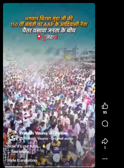 ফেক্ট ক্ৰেছেণ্ডো অসমীয়াৰ অনুসন্ধানত এই কথা নিশ্চিত হৈছে যে দাবীটো মিছা। এই ভিডিঅ’টো ২০২৫ চনৰ নৱেম্বৰৰ, য’ত আম আদমি পাৰ্টিৰ বিধায়ক চতুৰ বাসৱাই ভৰুচৰ নেত্ৰাঙত ভগৱান বীৰছা মুণ্ডাৰ ১৫০ সংখ্যক জন্ম জয়ন্তী উপলক্ষে এক অনুষ্ঠানৰ আয়োজন কৰিছিল।