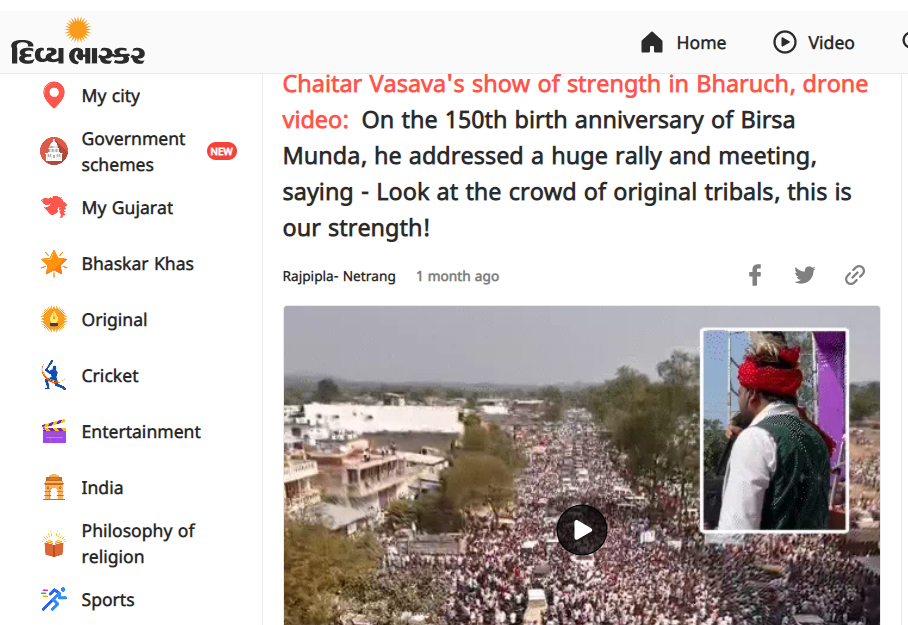 লগতে আৰু অধিক অনুসন্ধানৰ অন্তত আমি দিব্য ভাস্কৰে প্ৰকাশ কৰা এক প্ৰতিবেদন পালোঁ। য’ত তথ্য দিয়া হৈছিল যে, “ভাৰুচ জিলাৰ নেত্ৰাঙত বিপ্লৱী বীৰছা মুণ্ডাৰ ১৫০ সংখ্যক জন্ম জয়ন্তী উদযাপন কৰা হয়।এই কাৰ্যসূচীত মুখ্য অতিথি হিচাপে উপস্থিত থাকে দেদিয়াপাদৰ পৰা আম আদমি পাৰ্টিৰ বিধায়ক চৈতৰ বাসৱ। অনুষ্ঠানৰ অন্তত বিধায়ক বাসৱাই এক বিশাল জনসভাত ভাষণ প্ৰদান কৰে।”