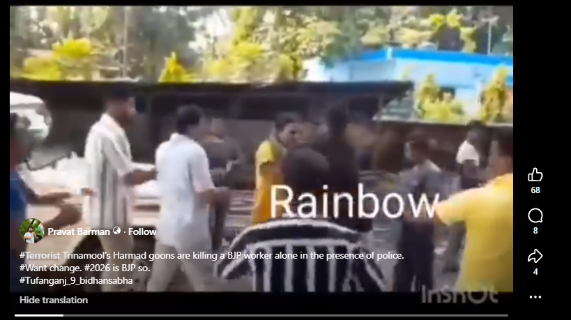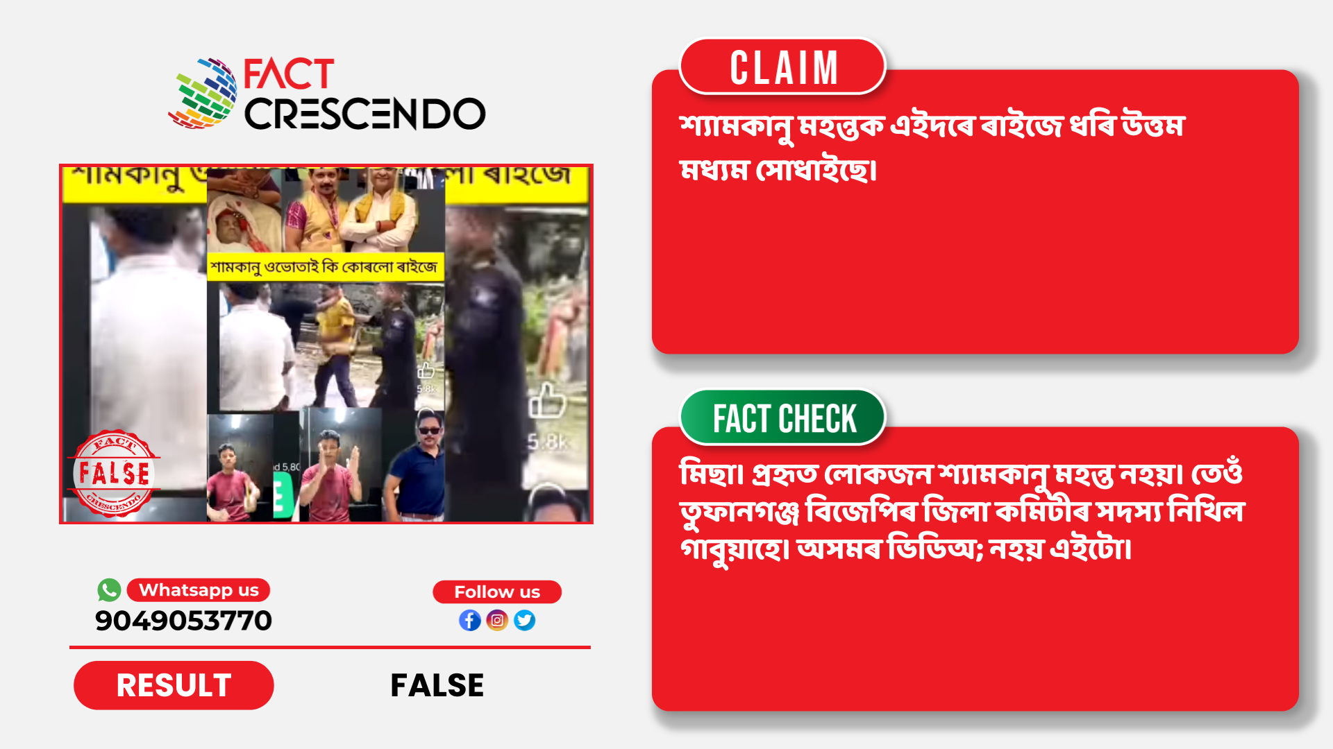 ফেক্ট ক্ৰেছেণ্ডো অসমীয়াৰ অনুসন্ধানত এই কথা নিশ্চিত হৈছে  দাবীটো মিছা। প্ৰহৃত লোকজন শ্যামকানু মহন্ত নহয়। তেওঁ তুফানগঞ্জ বিজেপিৰ জিলা কমিটীৰ সদস্য নিখিল গাবুয়াহে। অসমৰ ভিডিঅ; নহয় এইটো।