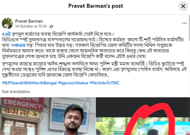 বাংলা ভাষাতে লিখা পোষ্টটোৰ কথাখিনিৰ পৰা আমি জানিব পাৰিলোঁ যে তুফানগঞ্জত বিজেপিৰ জিলা কমিটীৰ সদস্য নিখিল গাবুয়াক বহুলোকে প্ৰহাৰ কৰিছিল। পোষ্টটোত কোৱামতে তেওঁলোক আছিল তৃণমূল কংগ্ৰেছৰ সদস্য আৰু প্ৰহাৰ কৰা অন্যতম যুৱকজন হৈছে তুফানগঞ্জ হাস্পতালত গাৰ্ড হিচাপে কৰ্মৰত শুভম দত্ত।
